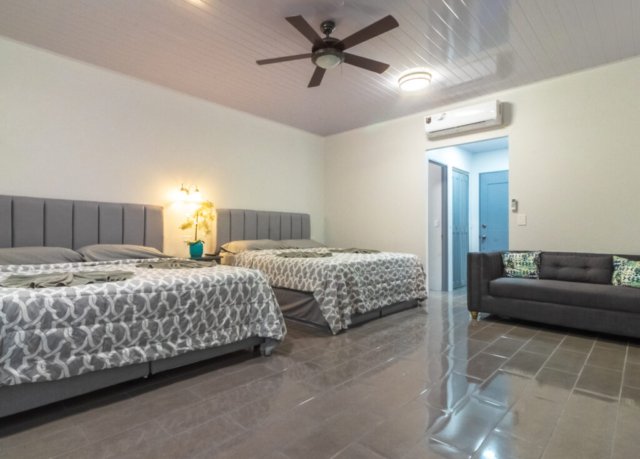 Maximum capacity: four people, on the second floor, balcony, view of the gardens, 50 m2. Mini fridge, A/C. TV, Wifi, private bathroom, two King beds